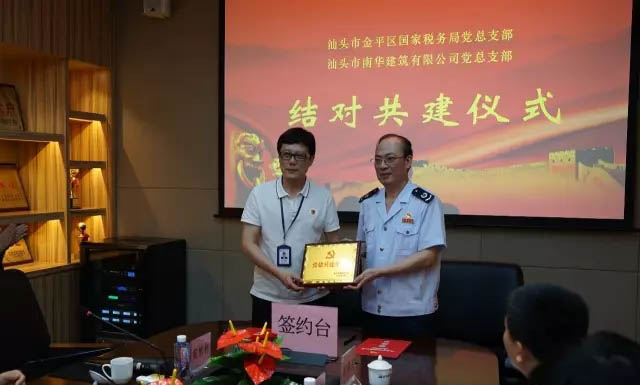 金平區(qū)國家稅務(wù)局黨總支部與我司黨總支部正式簽訂結(jié)對共建協(xié)議書,并向我司贈送“黨建共建單位”稱號及一批稅收政策書籍和稅收宣傳資料。
