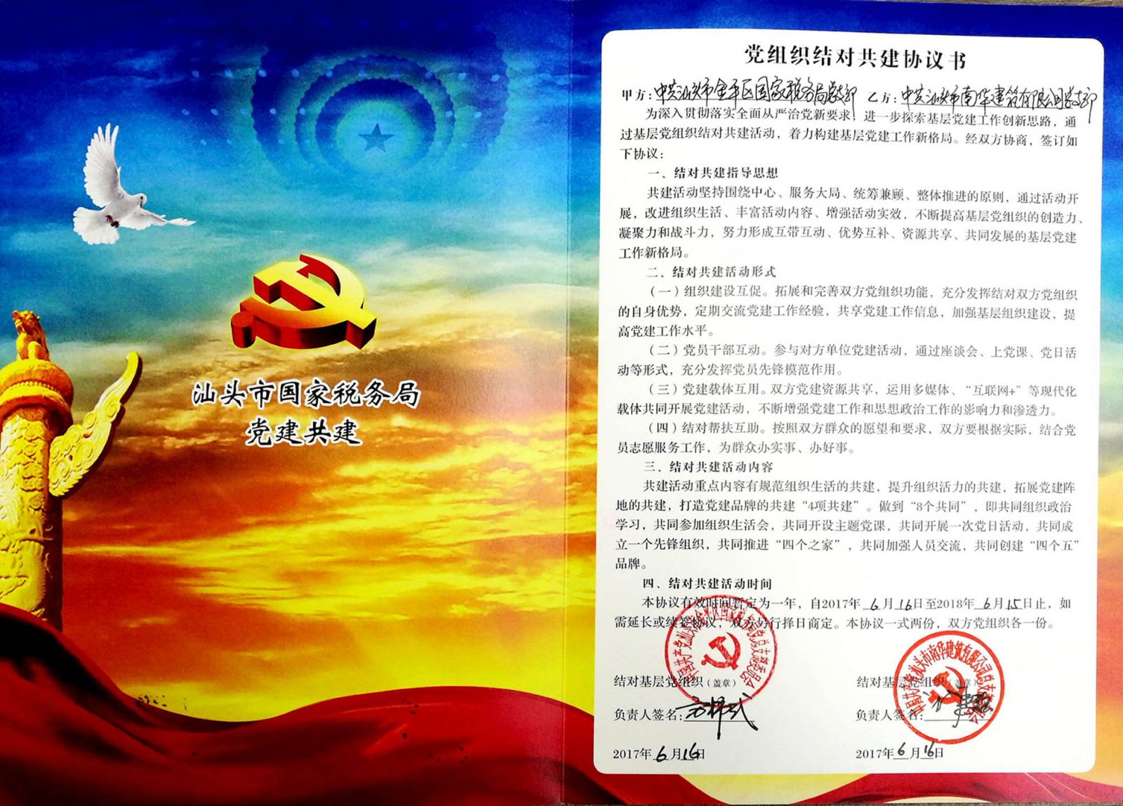 為貫徹落實(shí)全面從嚴(yán)治黨新要求,進(jìn)一步探索基層黨建工作創(chuàng)新思路,通過基層黨組織結(jié)對(duì)共建活動(dòng),著力構(gòu)建基層黨建工作新格局。為進(jìn)一步加強(qiáng)稅企雙向互動(dòng),構(gòu)造和諧稅企文化,6月16日,汕頭市金平區(qū)國(guó)家稅務(wù)局黨總支與我司黨總支結(jié)對(duì)共建活動(dòng)于我司舉行。